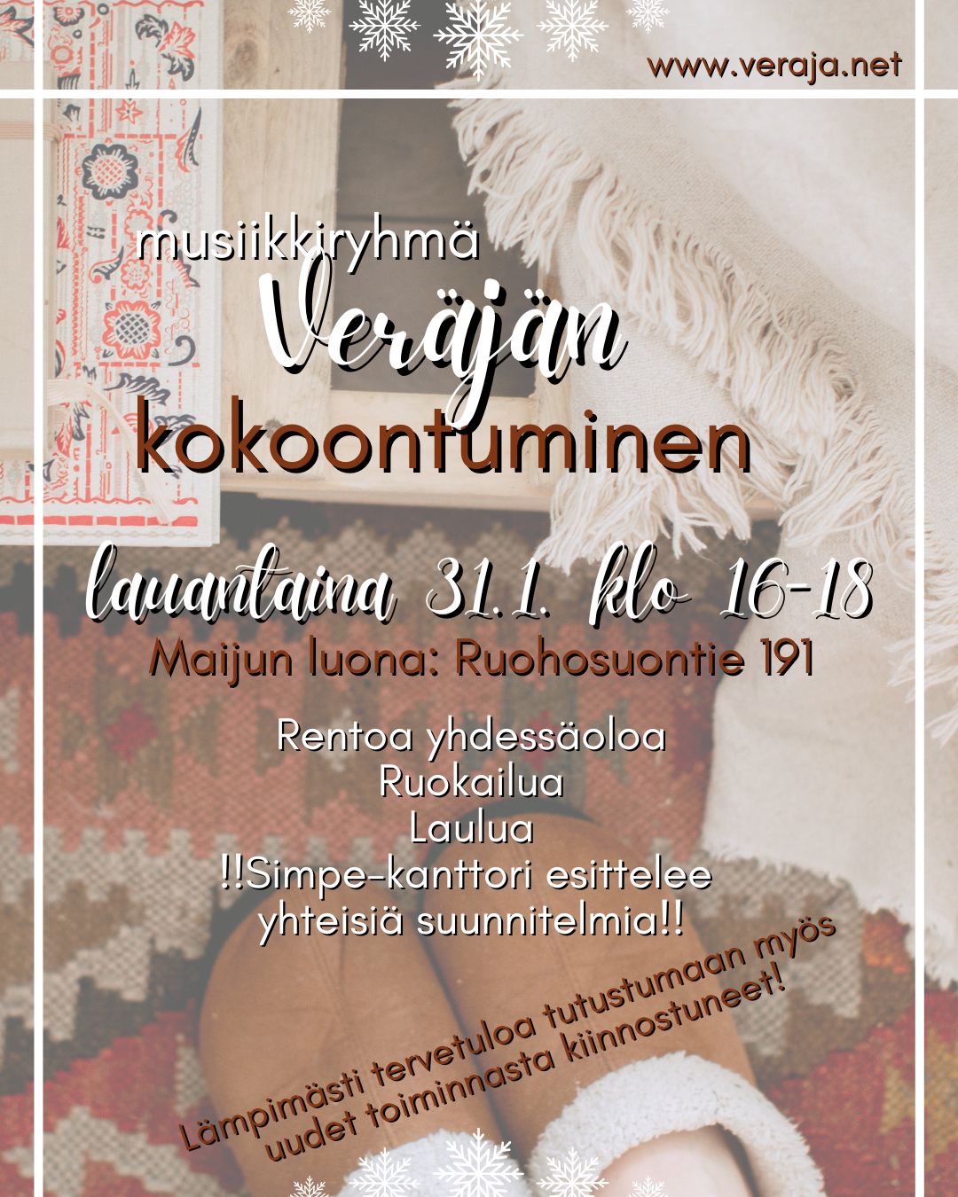 Musiikkiryhmä Veräjän kokoontuminen lauantaina 31.1.2026 klo 16 Maijun luona Ruohosuontie 191.